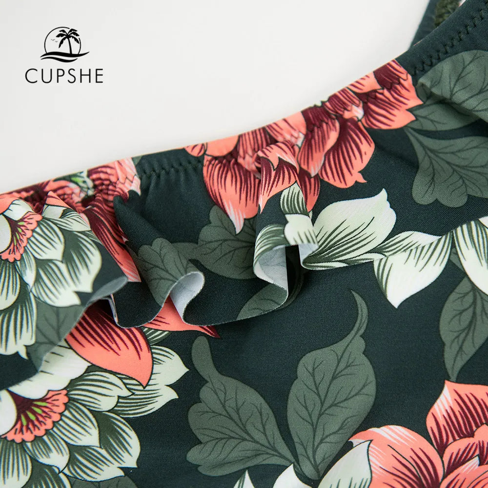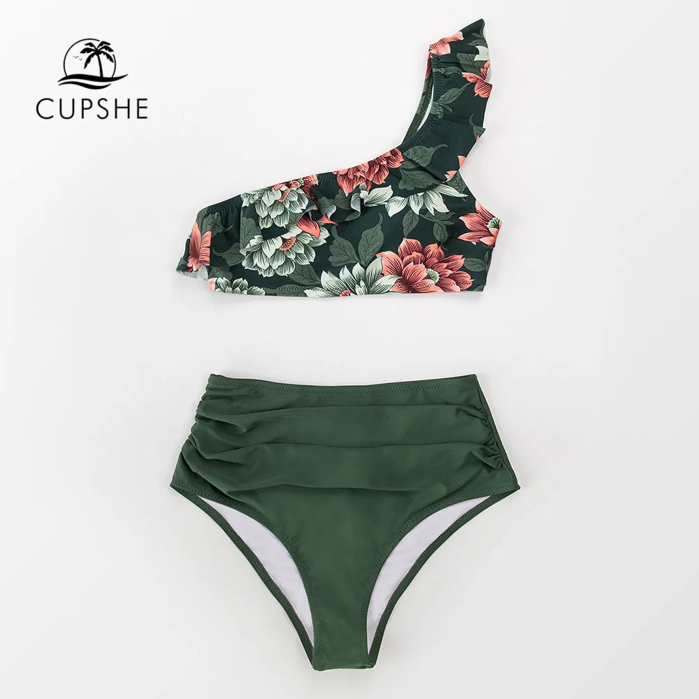Feel beautiful and confident in this elegant one-shoulder bikini set. Crafted from soft and comfortable polyester, it features a beautiful floral design for a timeless look. With true-to-size fit, you'll feel stunning all summer long!